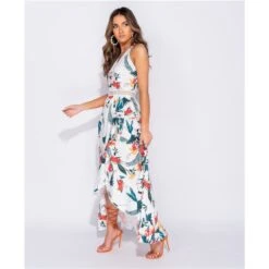 - Langes Damen Off-Shoulder Maxikleid aus luftig leichtem, fließendem Stoff mit tropischem Palmenmuster